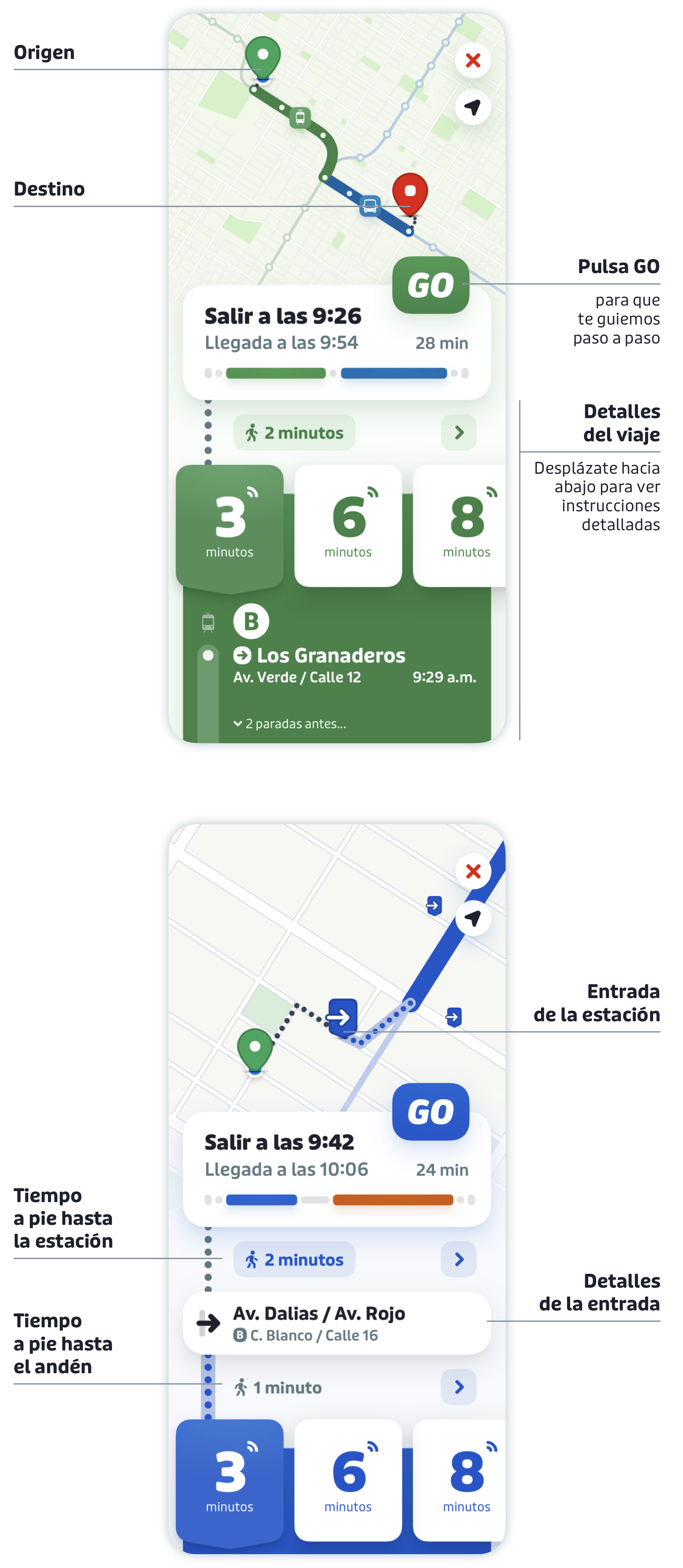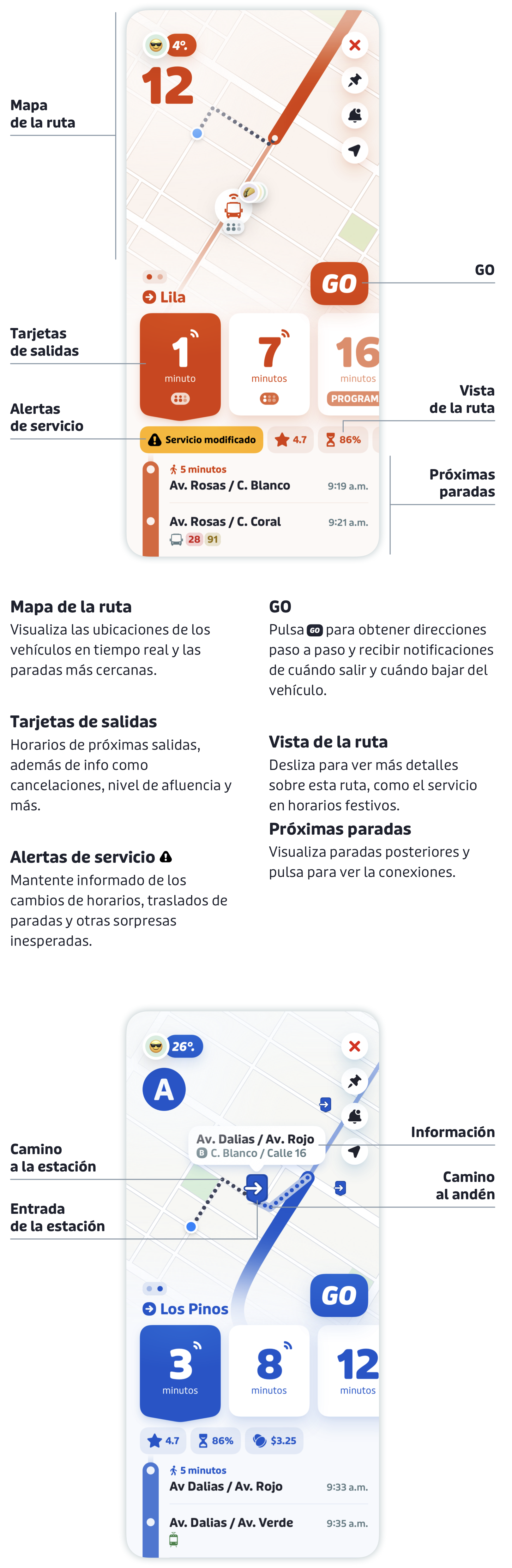 GO es el compañero de viaje personalizado de Transit. Pulsa GO para obtener notificaciones en tiempo real que te indican cuándo tienes que salir, cambiar de línea o bajarte.