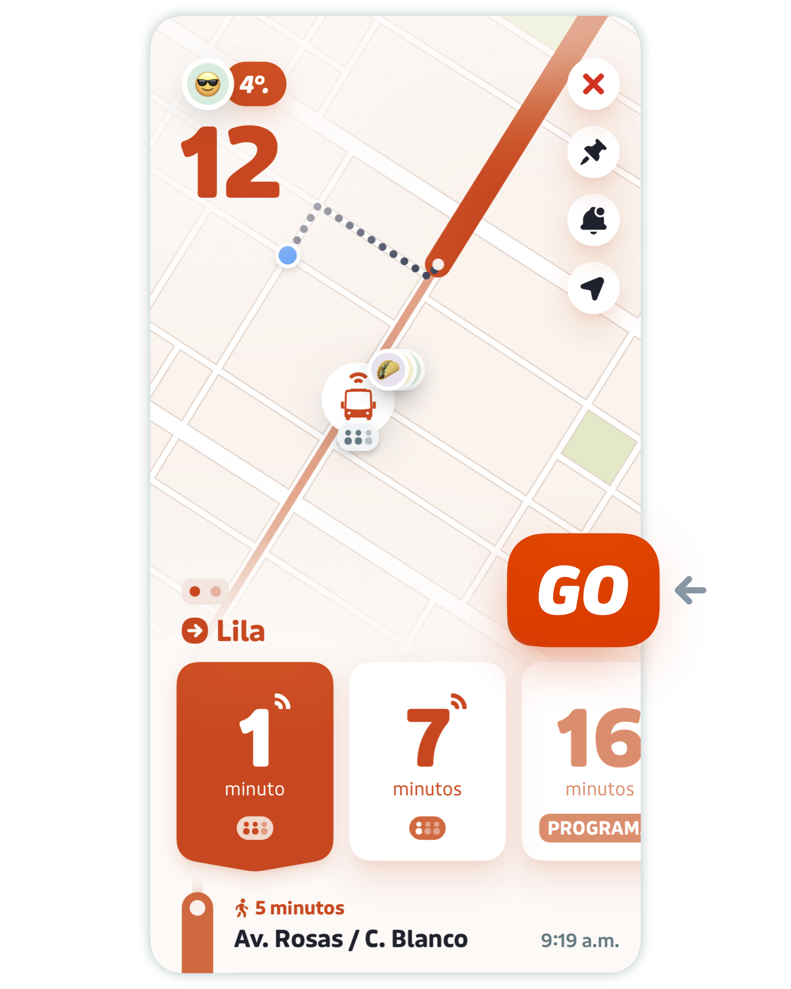 ¿Ya estás en la parada o cerca de ella? Selecciona la ruta que usarás en la ventana de inicio y pulsa GO.