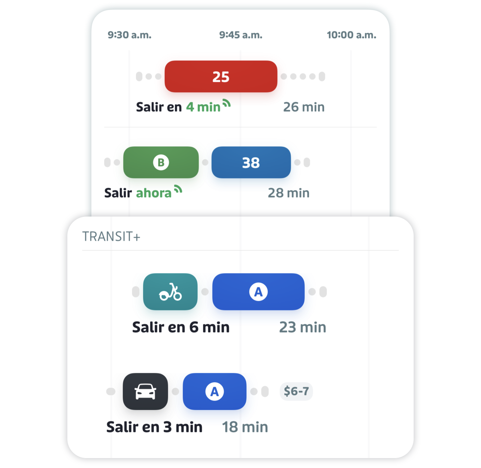 Transit+ es una mejora del planificador normal de viajes de Transit. Para ver itinerarios con recomendaciones de varios medios de transporte, planifica tu viaje igual que siempre usando el planificador de viajes.